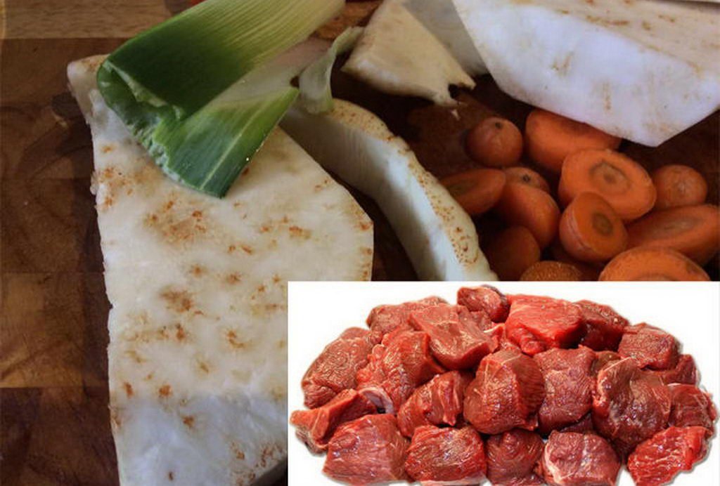 Danach dazugeben: das geputzte in Stücke Suppengrün und Tomaten. Nochmals eine halbe Std. schmoren lassen.