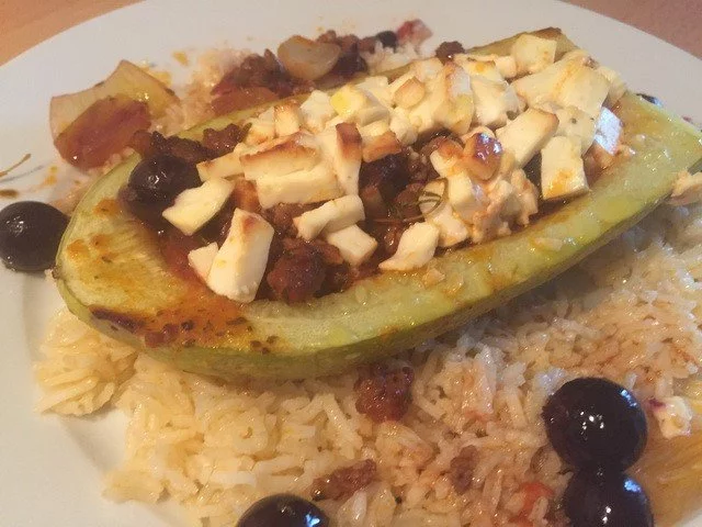 Zucchini halbieren, aushölen, in eine Auflaufform legen, mit der zuvor zubereiteten Masse füllen, den kleingewürfelten Feta obenauf. Die restliche Sauce/Flüssigkeit ringsrum verteilen, die geviertelten Schalotten in die „Hohlräume“ legen, ringsrum die Weintrauben verteilen.